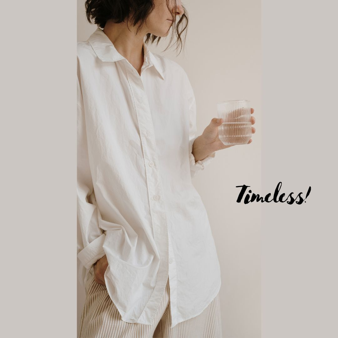 A White Button Down. Every woman looks amazing in a white button down shirt. Crisp and structured, soft and flowy, either works. It’s classy and elevated and you’ll look put together even if you don’t feel it!